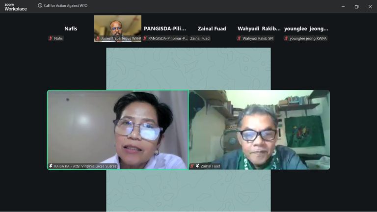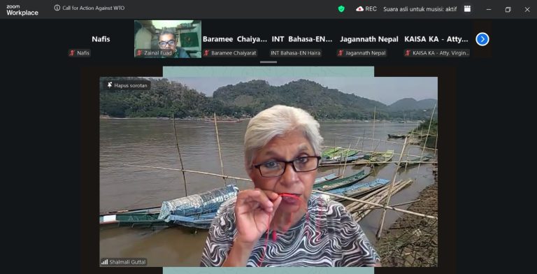 Shalmali Guttal menyampaikan bahwa WTO telah gagal memenuhi janji sebagai forum multilateral yang adil. “WTO adalah jebakan bagi negara berkembang. Tidak ada solusi nyata untuk kemiskinan, kelaparan, atau krisis global,” katanya. Ia menegaskan bahwa sistem perdagangan global seharusnya mengacu pada Deklarasi PBB tentang Hak Asasi Petani dan Orang yang Bekerja di Pedesaan (UNDROP), khususnya Pasal 28 yang menegaskan bahwa seluruh kerangka kebijakan harus selaras dengan pemenuhan hak asasi manusia. “Di sisi lain, pemerintah juga wajib mengacu pada Pasal 2 UNDROP untuk melindungi hak-hak petani dari sistem pangan yang tidak adil, termasuk memastikan adanya konsultasi yang bermakna sebelum mengambil kebijakan,” tegasnya.