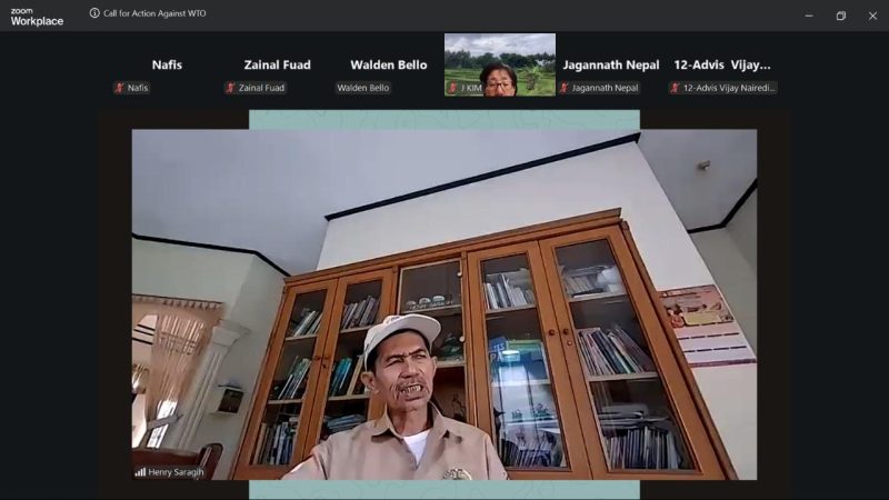 Webinar ini menghadirkan sejumlah pembicara dari berbagai organisasi global, di antaranya Walden Bello, Ranja Sangupta dari Third World Network (TWN), Jones Thomas dari World Forum of Fishers Peoples, serta Atty. Virgie Suarez dari Kilusan. Rangkaian kegiatan juga diisi dengan laporan langsung aksi anti-WTO di Kamerun. Selanjutnya, Shalmali Guttal, anggota kelompok kerja UNDROP, menyampaikan pernyataan penutup. Webinar ini diikuti oleh peserta dari berbagai kawasan, tidak hanya Asia, tetapi juga Afrika, Eropa, hingga Australia. Kegiatan kemudian ditutup dengan pembacaan deklarasi yang dilanjutkan aksi virtual bersama.